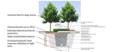 File:Screenshot 2025-09-22 161822.png|This hybrid trench and bioretention system combines flood protection with water quality and water balance benefits. Active storage above the underdrain provides channel and flood control, while infiltration below the underdrain improves water quality and maintains water balance. The underdrain is positioned close to the trench bottom to maximize storage capacity and may be fitted with an orifice to regulate release rates, ensuring full use of storage even during the 100-year event. Because infiltration rates increase with hydraulic head, this design can achieve higher volume reduction than conventional LID practices not intended for flood control. Inlets consist of a distributed network of curb cuts connected to high-flow cobble/gravel columns (about 1 × 2 m). A similar concept can also be applied using stormwater chambers or underground infiltration trenches. Base image: Schollen and Co. <ref>https://www.toronto.ca/ext/digital_comm/pdfs/transportation-services/green-streets-technical-guidelines-document-v2-17-11-08.pdf</ref>) | File:Screenshot 2025-09-22 161822.png|This hybrid trench and bioretention system combines flood protection with water quality and water balance benefits. Active storage above the underdrain provides channel and flood control, while infiltration below the underdrain improves water quality and maintains water balance. The underdrain is positioned close to the trench bottom to maximize storage capacity and may be fitted with an orifice to regulate release rates, ensuring full use of storage even during the 100-year event. Because infiltration rates increase with hydraulic head, this design can achieve higher volume reduction than conventional LID practices not intended for flood control. Inlets consist of a distributed network of curb cuts connected to high-flow cobble/gravel columns (about 1 × 2 m). A similar concept can also be applied using stormwater chambers or underground infiltration trenches. Base image: Schollen and Co. <ref>https://www.toronto.ca/ext/digital_comm/pdfs/transportation-services/green-streets-technical-guidelines-document-v2-17-11-08.pdf</ref>) | ||