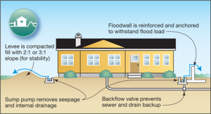 Floodwall and levee protects building from flood water (Reduce Flood Risk, 2022)[8].