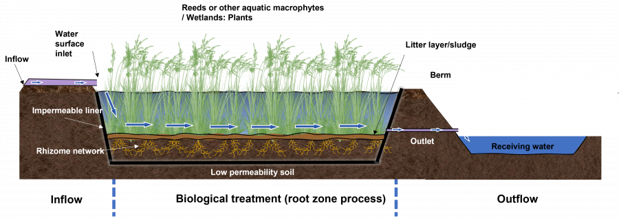 Constructed wetlands differ based on how water travels through the system (Grant, 2000; USEPA, 1995; Jacques Whitford Consultants, 2008)[5][6][7]: