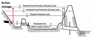 Flood and water quality control in stormwater ponds. Water quality control is provided by the permanent pool, Channel and flood protection are provided by the temporary or active storage above the permanent pool. Source: (MECP 2003). Wet ponds do not provide runoff reduction or thermal mitigation benefits.
