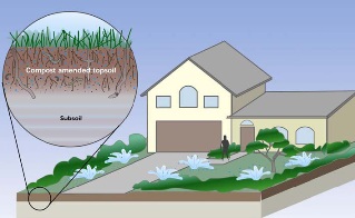 A simple, inexpensive lot level stormwater management practice is the application of a deeper than standard layer of high quality topsoil in pervious landscaped areas, especially those that will receive roof runoff from downspouts. This practice is of particular interest because at the end of construction work there is always a surplus of topsoil from clearing and grading that otherwise must be hauled away at a cost to the developer. The practice of adjusting grading of landscaped areas, scarifying the subsoil to reverse compaction, and applying a deeper layer of organic topsoil has the potential to reduce costs associated with having to haul it away. It also has the potential to absorb, infiltrate and evapotranspire a greater amount of stormwater than standard landscaping practices, thereby providing runoff reduction benefits. Amending poor quality topsoil or compacted subsoil with compost increases moisture and pollutant retention capacity and permeability, and reduces bulk density and erosivity. In addition, this practice also provides a better growing environment for grass, shrub and tree plantings, requiring less irrigation and fertilizer to become established than plantings in more shallow, unimproved topsoil overlying compacted subsoil.